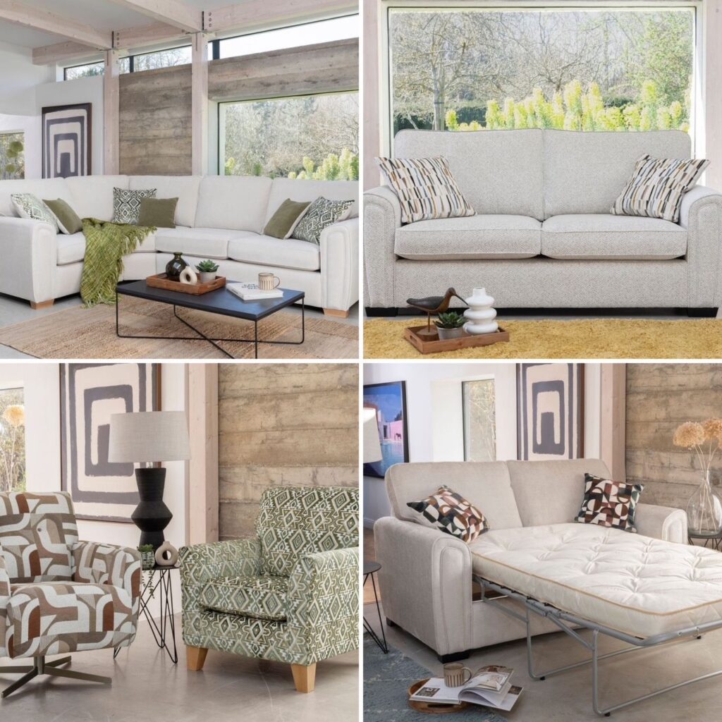 This modern suite with retro charm is the latest addition to our showroom, featuring refreshed sophisticated tones and textured plain chenille’s with globally inspired accents. This versatile collection includes: Grand, Three & Two Seat Sofas Two & Three Seat Sofa-beds Snuggle Chair, Chair, Accent & Swivel Chair Optional scatter back on selected pieces Matching stool…