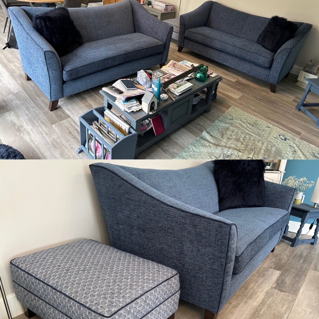 These two sofas have been given a fresh new look with a rich blue fabric that truly brings them to life. As always, we’ve added our signature contrast piping for that extra touch of style. To complete the set, we used a contemporary blue trellis fabric on the footstool .